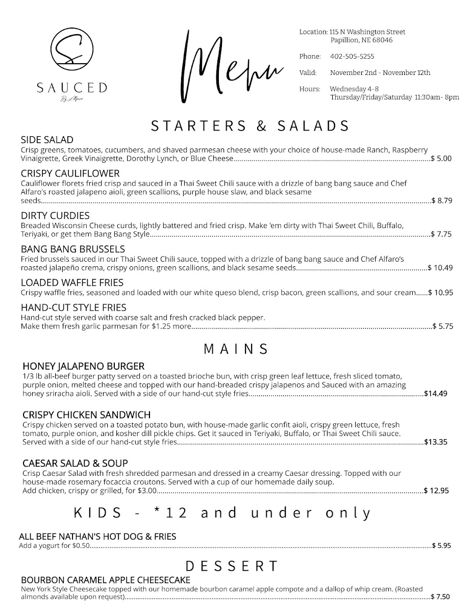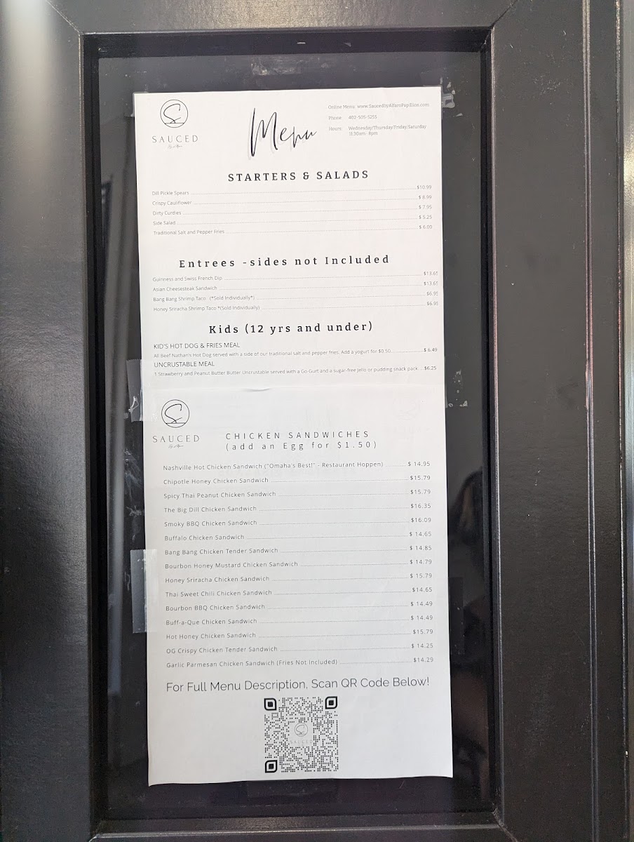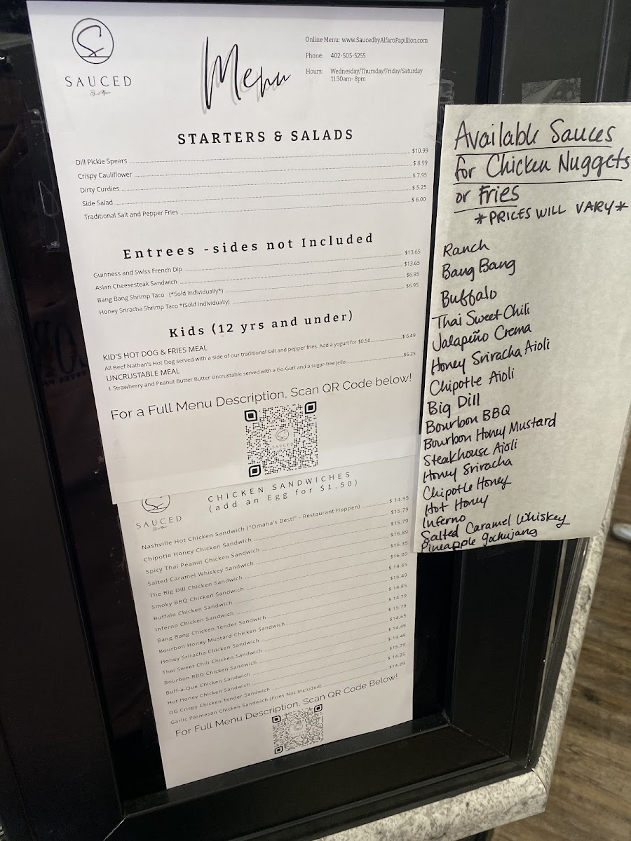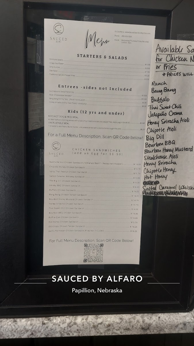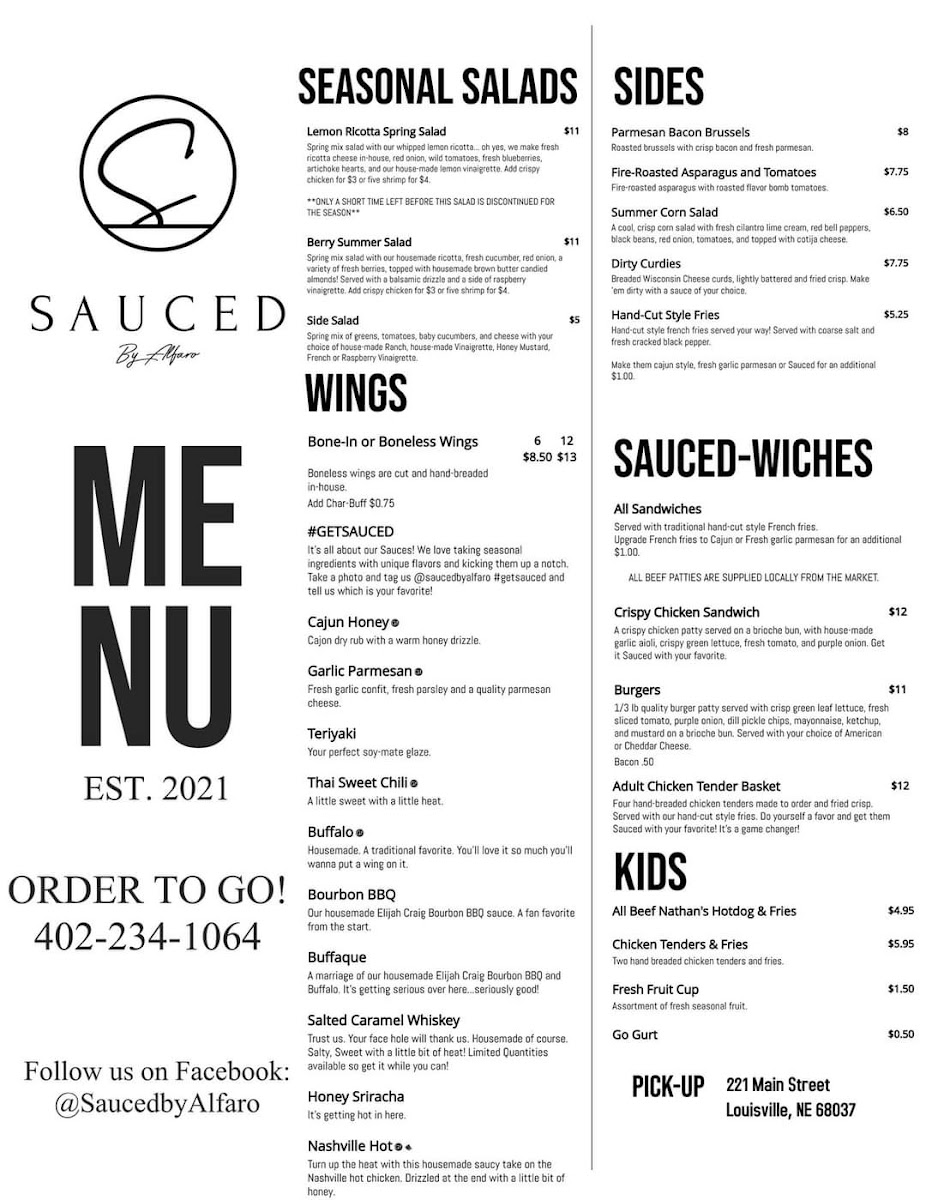 At Sauced by Alfaro, located in the heart of Papillion, Nebraska, culinary passion meets a welcoming atmosphere. Founded on the love for bold flavors, the brand specializes in delectable, made-to-order dishes, with standout offerings like the Nashville Hot Chicken and an array of mouthwatering sauces. Customers rave about the freshness and generous portions, as well as the attentive staff who enhance the dining experience. Each visit feels like a culinary adventure, with options that cater to every palate—from savory wings to crispy sides. At Sauced, every bite tells a story of dedication to flavor and community.